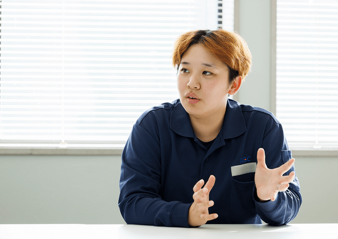 高校では調理を専門に学んでいましたが、手先が器用だったことから工業系も視野に入れ、AGCグラスプロダクツの工場見学に参加しました。様々な工程を見せていただく中で、現在所属している部署のライン作業を見た時、そこで働く自分の姿が鮮明にイメージでき、「やってみたい!」と直感的に感じたことが最初のきっかけです。