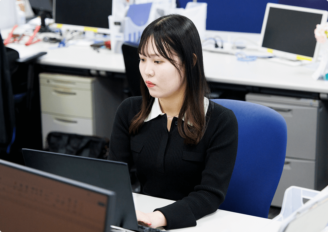 「調達」と聞いても馴染みがないかもしれませんが、簡単に言えば、在庫が足りなくなりそうな資材の発注をかけたり、メーカーと納期の調整をしたりする仕事です。他にも輸入業務では、英語でのやり取りもあります。調達部署の使命は「欠品・過剰在庫を絶対に起こさないこと」。そのため、毎日在庫数をチェックして、適切なタイミングで発注をかけることを心がけています。正直、数字の管理は得意な方ではないのですが、日々頑張っています!